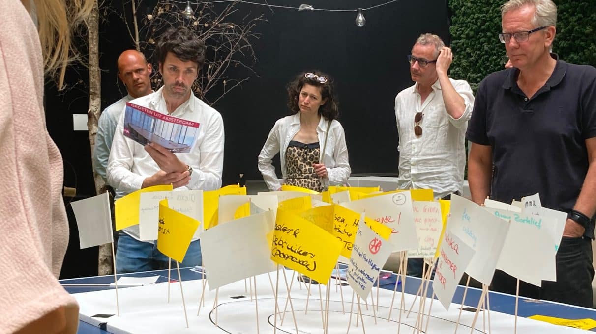 In de tweede ronde zijn de gele vlaggetjes aan de beurt. Hierop mogen de deelnemers stakeholders schrijven die nu nog niet vertegenwoordigd zijn, maar die wel gehoord en gezien moeten worden. Vol enthousiasme schrijven deelnemers de vlaggetjes vol met termen als: ondernemersverenigingen, directie van Schiphol, stadsgidsen, toeristen, bewoners, sekswerkers en zelfs dealers. Waarvan de laatste vier veelal in de buitenste cirkel worden geplaatst. En dat maakt de tongen los. Dit gaat naadloos over in de derde ronde, waarin onderzoeker Swen reflectievragen stelt en de discussie verder op gang brengt.