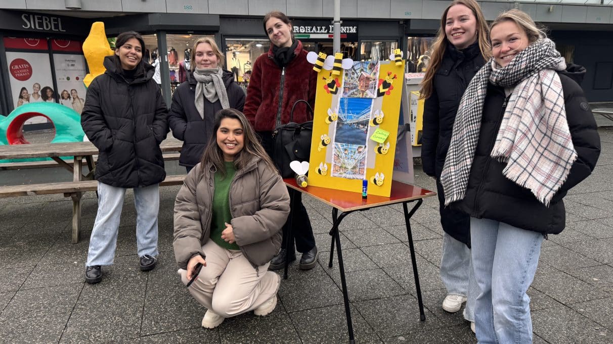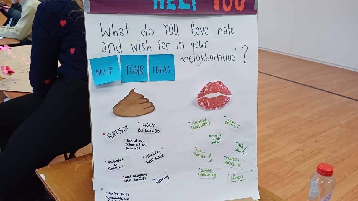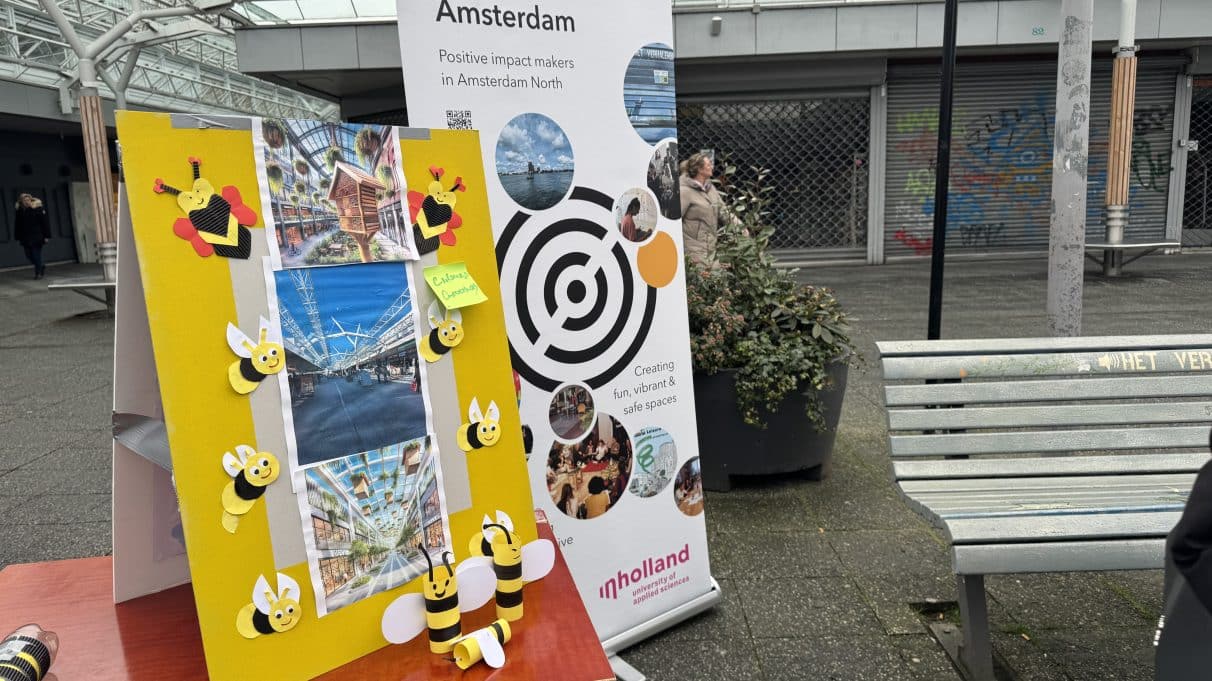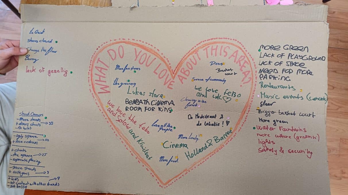 Met zelfgemaakte “conversation starters” gingen de studenten in gesprek met bezoekers van het Buikslotermeerplein. Vanuit het thema “From Livable to Lovable” verzamelden ze eerste reacties en ideeën over de beleving van deze plek.