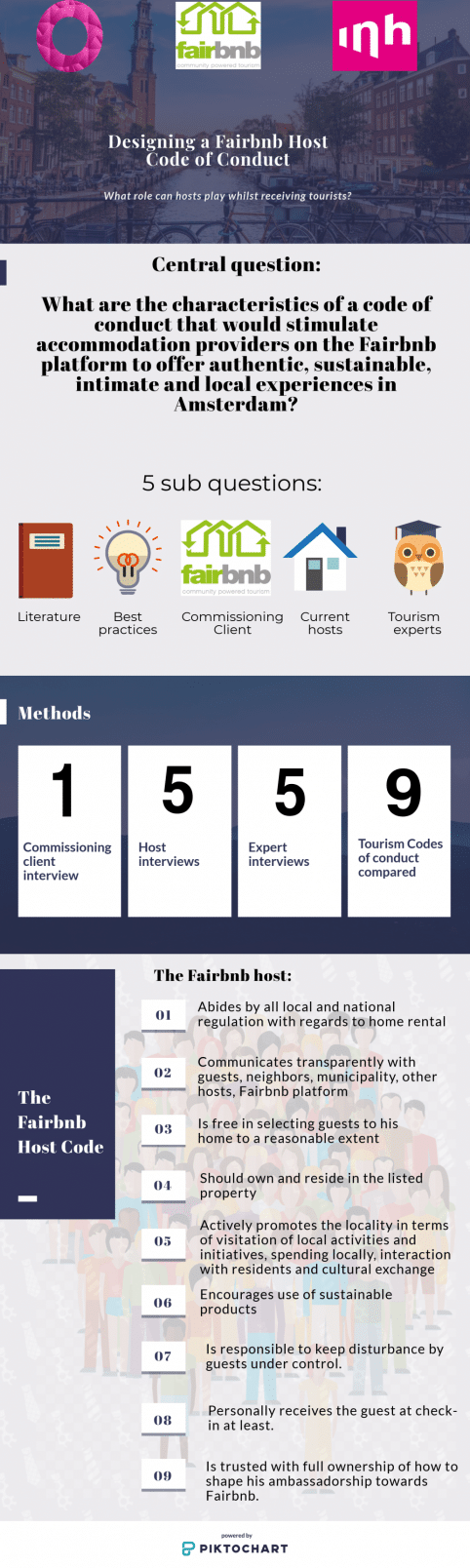 Fairbnb is één van de oudste partners van het Urban Leisure and Tourism Lab Amsterdam. Al sinds 2018 worden zowel studenten als docent-onderzoekers ingezet voor het beantwoorden van vraagstukken of oplossen van problemen. Zo is student Joost Visser afgestudeerd met een marketing-communicatieplan waarmee Fairbnb nog beter potentiële hosts kan bereiken voor het aanbieden van accommodatie. Docent-onderzoekers Miranda Kamp en Swen Waterreus hebben in 2019 onderzocht hoe de accommodatie-aanbieders kunnen bijdragen om de beleving van de bezoeker zo authentiek, verantwoord en intiem mogelijk te maken. Het resultaat van dit onderzoek was een Code of Conduct document met richtlijnen waar hosts zich aan kunnen houden om aan bovenbeschreven authentieke beleving bij te dragen. Onze samenwerking met Fairbnb heeft er overigens aan bijgedragen dat het ULT-lab meedoet aan een Europees Horizon2020 onderzoeksproject. Kijk voor meer informatie over Smartdest op deze link.